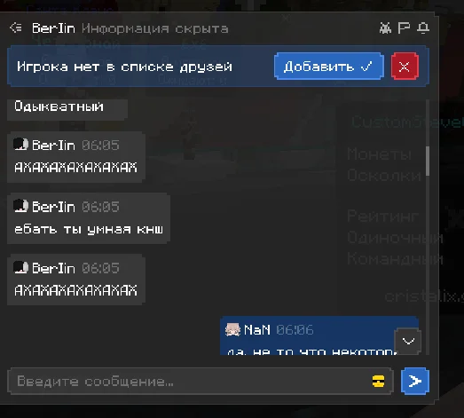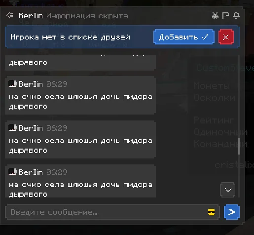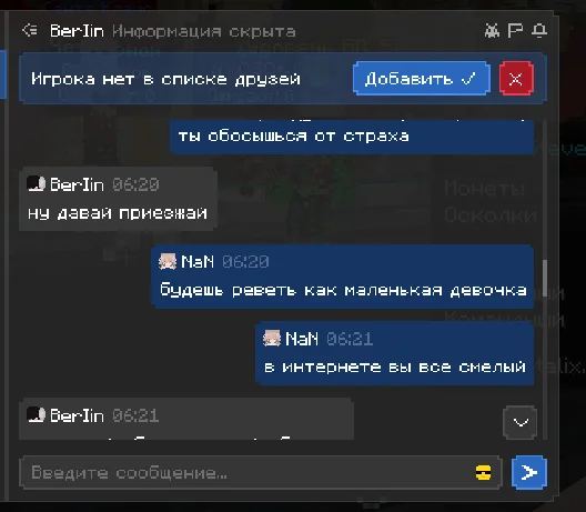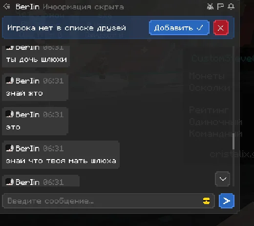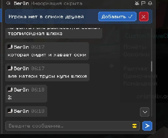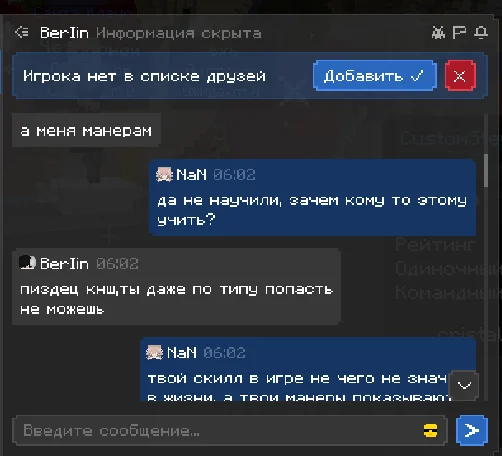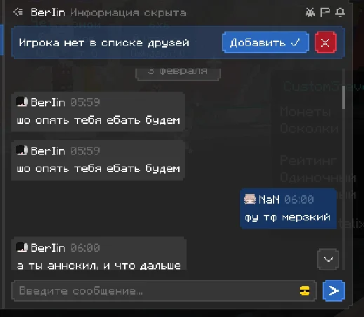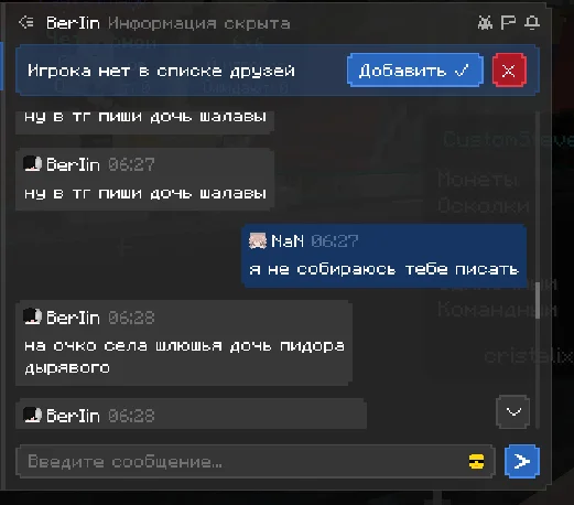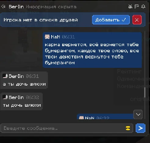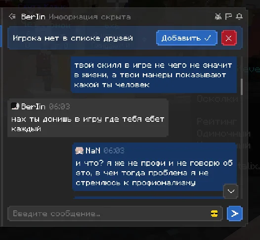 здраствуйте, хотела бы пожаловаться на игрока, прошу прощения за то что сама немного подаваоась на провокации и может говорила что то неприемлимое, но сами посмотрите как этот человек разговаривал со мной, я настоятельно прошу, забанить этого человека на самый длительный срок, который возможен. я не знаю делают ли что то за то что человек пишет в личных сообщениях, если нет то это очень обидно. ведь на платформе играет много детей, такие люди могут испортить им психику и человек останется без наказаным, это ведь не правильно. по этому попрошу обратить на этого человека должное внимание, ведь такое поведение не одыкватное, пусть он пишет и не в общем чате, но суть остается одна и та же. он оскорбляет и тд. что делать как я предпологаю нельзя. очень надеюсь что человек получит по за слугам.