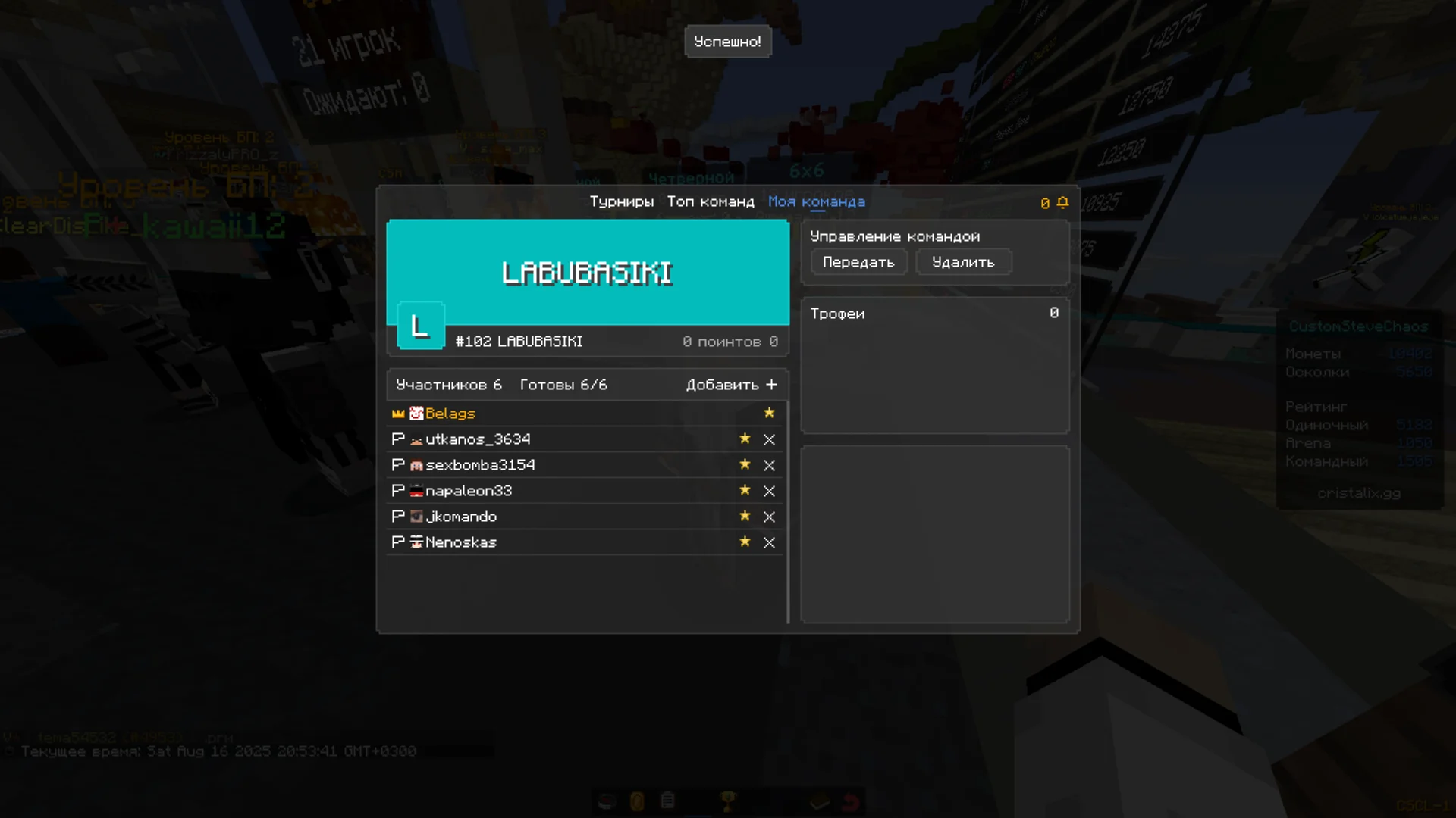 3. Полноэкранный скриншот состава вашей команды из турнирного NPC.